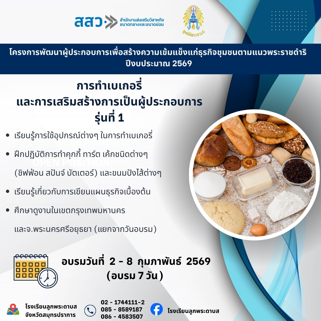 “การทำเบเกอรี่และการเสริมสร้างการเป็นผู้ประกอบการ รุ่นที่ 1” ภายใต้ “โครงการพัฒนาผู้ประกอบการเพื่อสร้างความเข้มแข็งแก่ธุรกิจชุมชนตามแนวพระราชดำริ ปีงบประมาณ 2569”