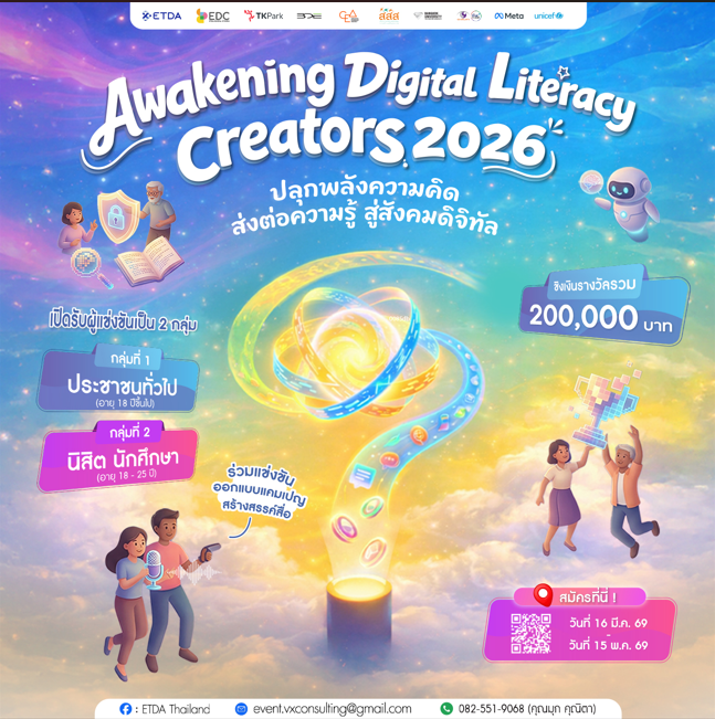 📣 เปิดรับสมัครแล้ว! “Awakening Digital Literacy Creator 2026” เวทีประชันไอเดียสร้างสรรค์ ชวนคนไทยรู้เท่าทันโลกดิจิทัลและ AI ที่เปลี่ยนเร็ว พร้อมโอกาสต่อยอดผลงานให้ใช้งานจริงกับ ETDA 🎉