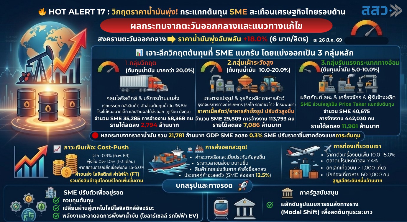 🔍 วิเคราะห์เชิงลึก โครงสร้างที่เปราะบางและทางรอดของเศรษฐกิจ สสว. มองว่าจากวิกฤตพลังงานครั้งนี้สะท้อน "จุดเปราะบาง" ของเศรษฐกิจไทยที่พึ่งพาการนำเข้าน้ำมันจากตะวันออกกลางสูงถึงร้อยละ 58.0 นอกจากนี้ SME ไทย ส่วนใหญ่ดำเนินธุรกิจภายใต้ส่วนต่างกำไร (Profit Margin) ที่ค่อนข้างแคบ โดยค่าเฉลี่ยของอัตรากำไรขั้นต้น (Gross Profit Margin) ในกลุ่ม SME ที่มีอยู่ ร้อยละ 28.0 แต่มีกลุ่มธุรกิจจำนวนมาก ที่มีกำไรขั้นต้นต่ำกว่าร้อยละ 20.0 เช่น ภาคเกษตรกรรม ประมง ค้าส่งค้าปลีก และสิ่งทอ เมื่อต้นทุนพลังงานและค่าขนส่งเพิ่มขึ้นอย่างก้าวกระโดด ธุรกิจเหล่านี้จึงไม่มี "ส่วนต่างกำไร" เพียงพอที่จะดูดซับต้นทุนไว้ได้ แรงกดดันด้านต้นทุนที่เพิ่มขึ้นในกลุ่ม SME คาดว่า จะส่งผลกระทบต่อเนื่องไปยังภาคแรงงาน ซึ่งอาจจะต้องเผชิญกับการลดตำแหน่งงานหรือการลดค่าจ้าง เนื่องจากผู้ประกอบการ SME ต้องลดรายจ่ายเพื่อให้ธุรกิจดำเนินต่อไปได้