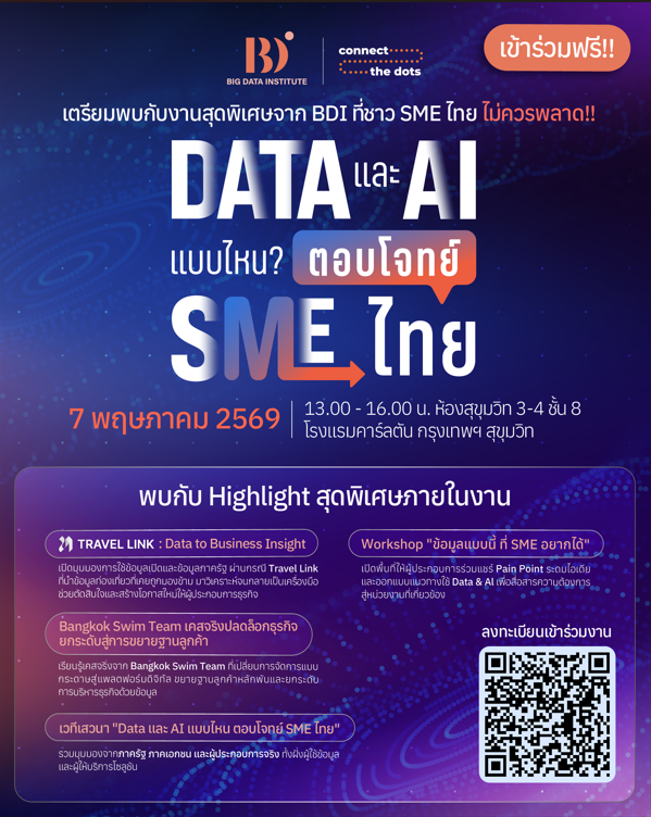 ลงทะเบียนฟรี! >>> https://bridge.bdi.or.th/events/ctd-7may-data-ai-sme/
