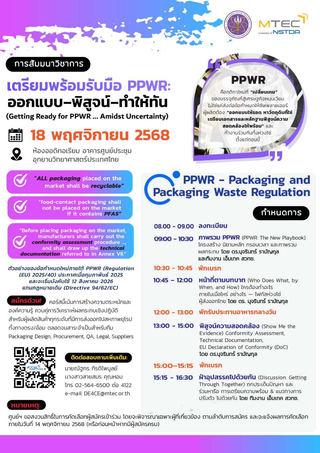 เวทีสำคัญเพื่อทำความเข้าใจ PPWR (Regulation (EU) 2025/40) กฎหมายบรรจุภัณฑ์ใหม่ของสหภาพยุโรป ที่จะยกระดับให้บรรจุภัณฑ์ต้องเป็นมิตรต่อเศรษฐกิจหมุนเวียน รีไซเคิลได้จริง และเป็นมิตรต่อสิ่งแวดล้อม